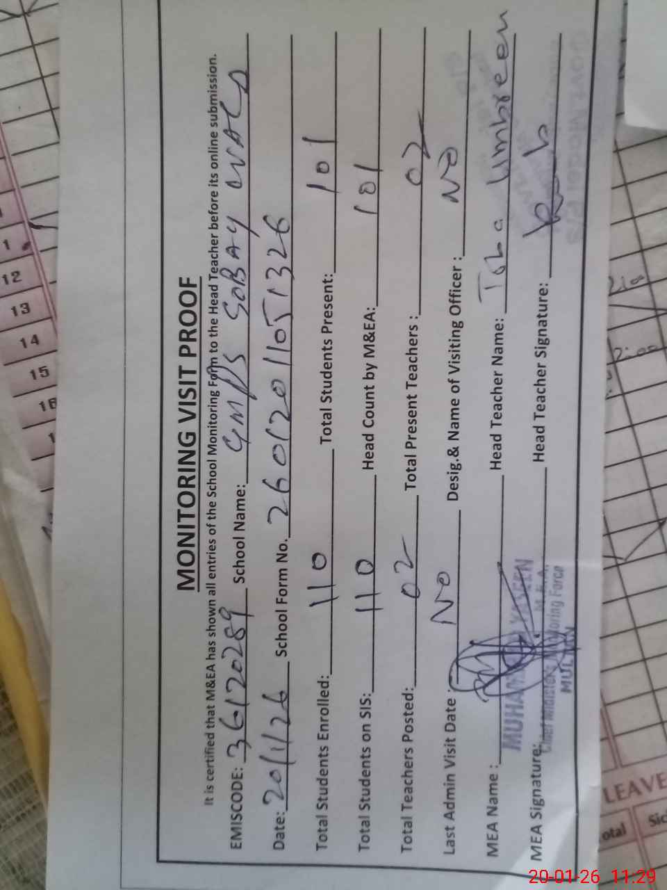 | Attendance Register | Head Teacher | MEA with School | Visit Proof |