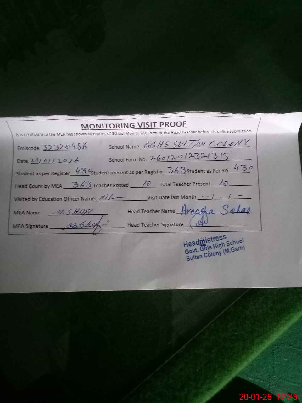 | EMIS Code: 32320456 | Name of School: GGHS SULTAN COLONY | |||