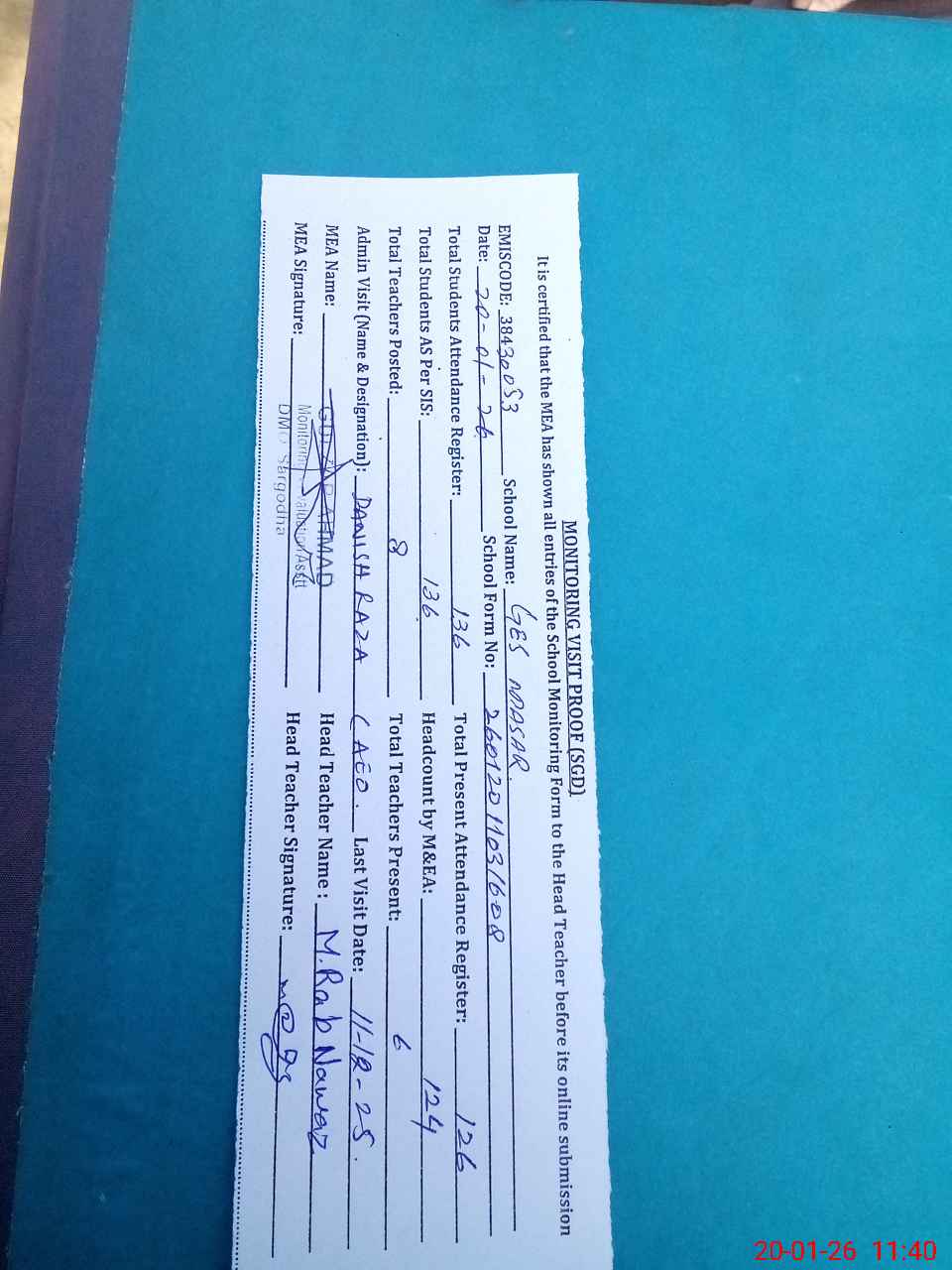 | Attendance Register | Head Teacher | MEA with School | Visit Proof |