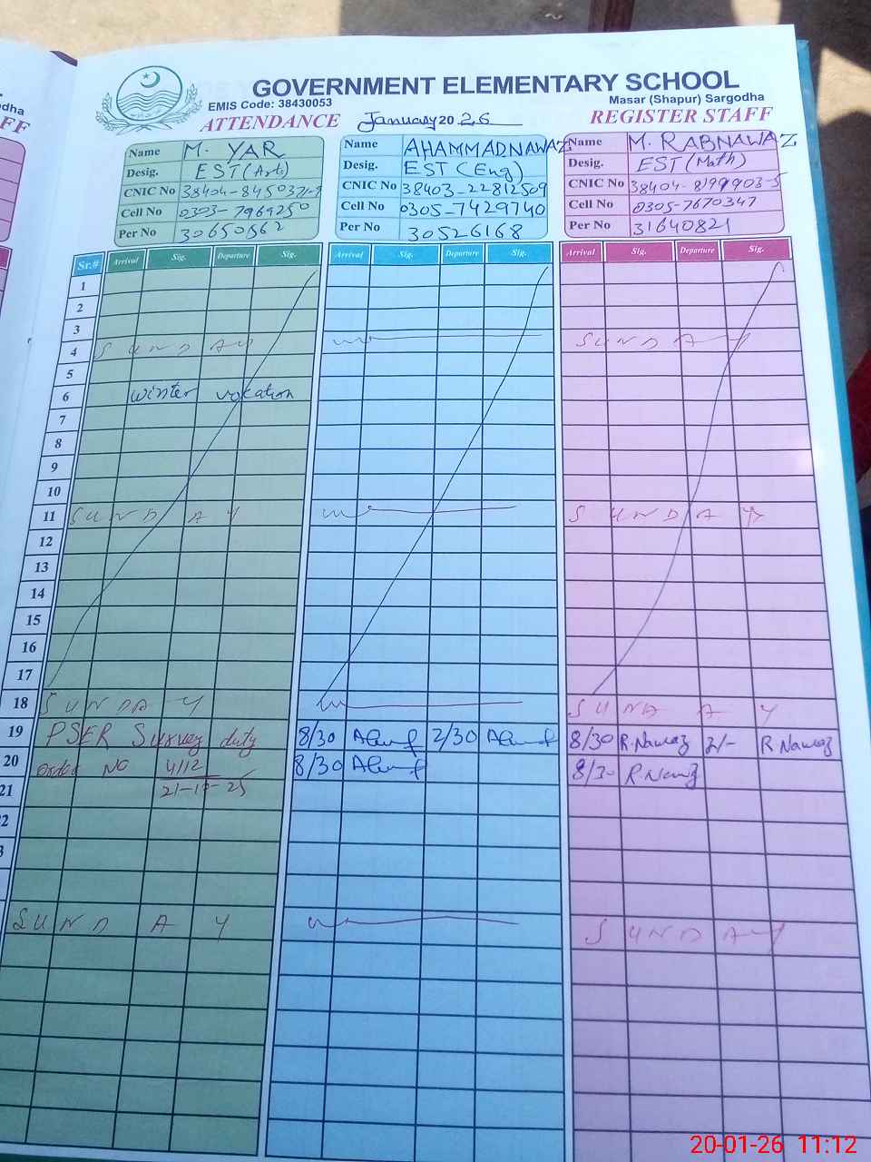 | CNIC | Full Name | Designation | R/C | Absence during last cal. month |