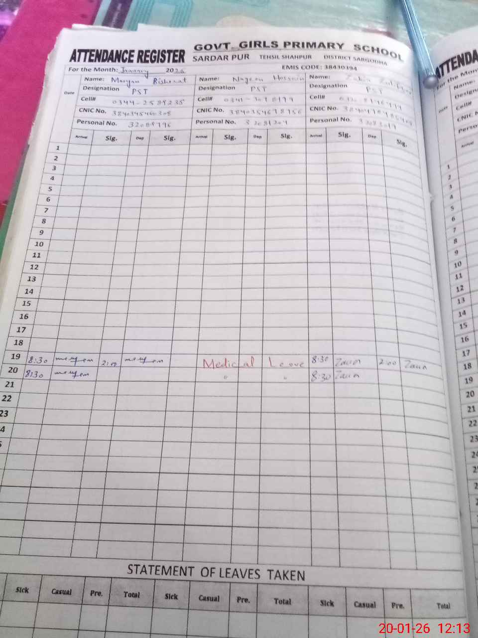 | CNIC | Full Name | Designation | R/C | Absence During Last Calender Month |