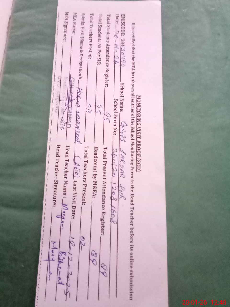 | Attendance Register | Head Teacher | MEA with School | Visit Proof |