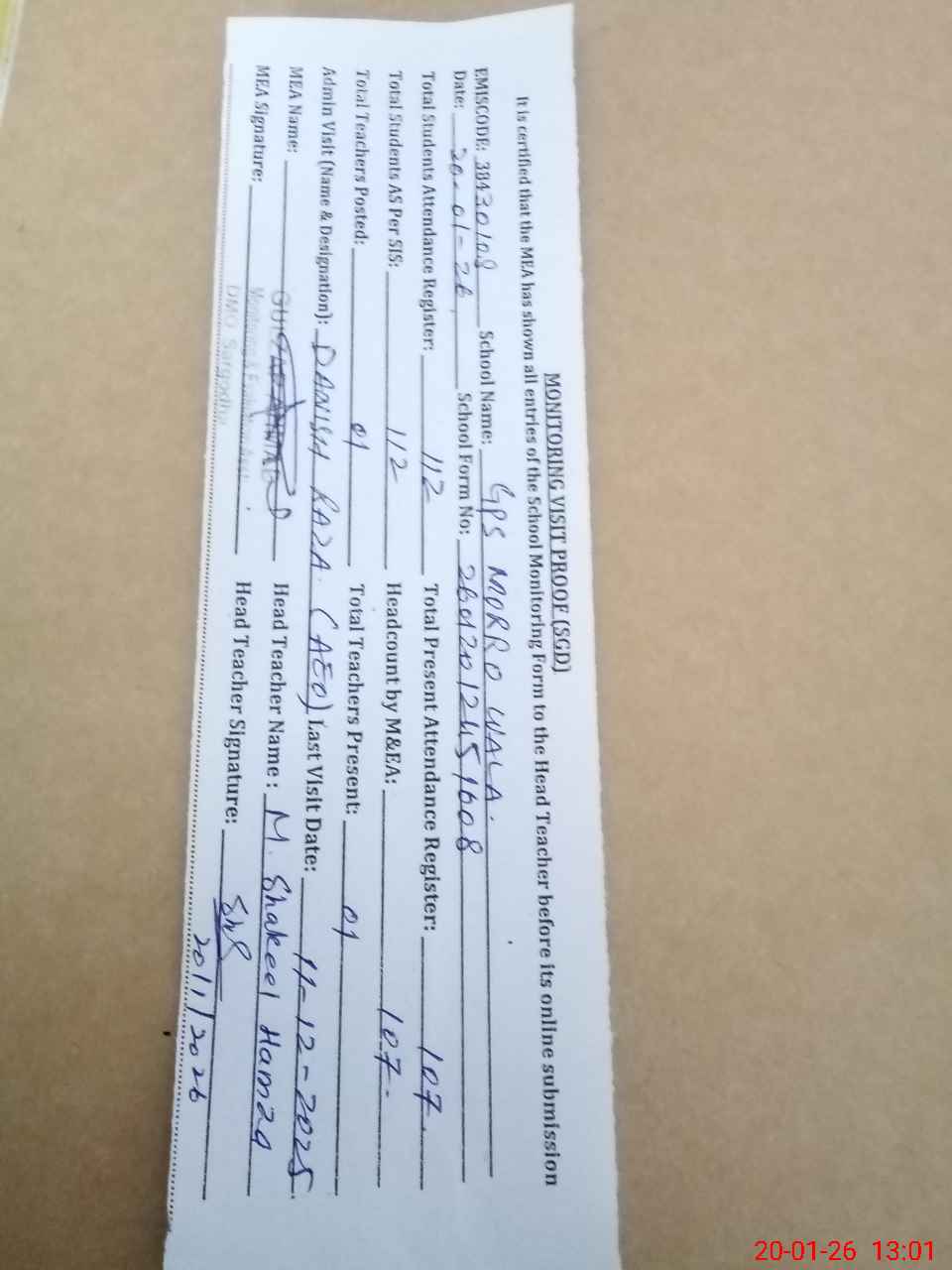 | Attendance Register | Head Teacher | MEA with School | Visit Proof |