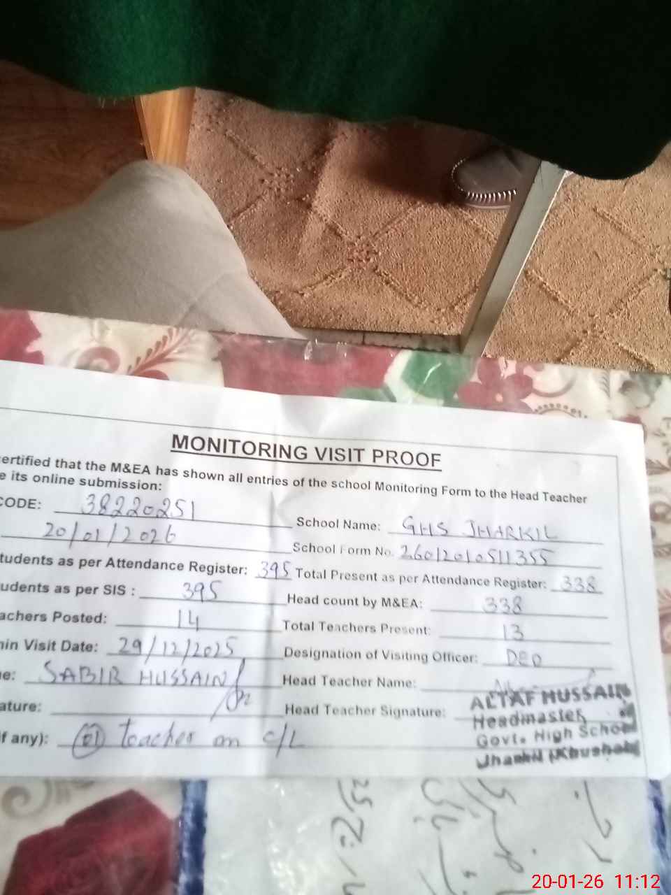 | Remarks (Use Separate Page if Required): no teacher absent total students on register 395 total students on SiS 395 last admin visit by DEO SE on 29 Dec 2025 | |||||