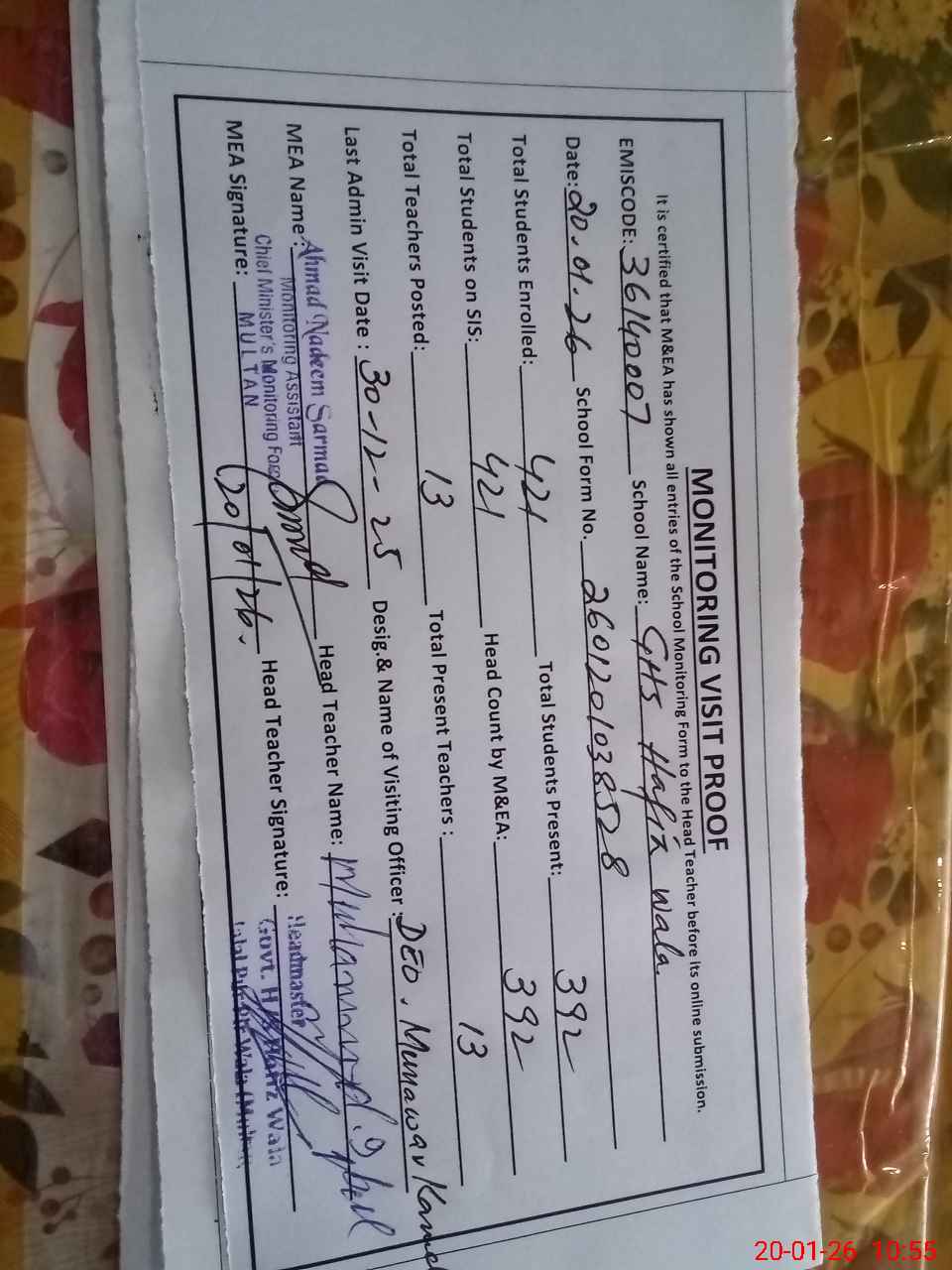 | Certified that this School was Inspected by the Undersigned MEA/DMO Today and the Information Stated Above is as Per Record. | |||||