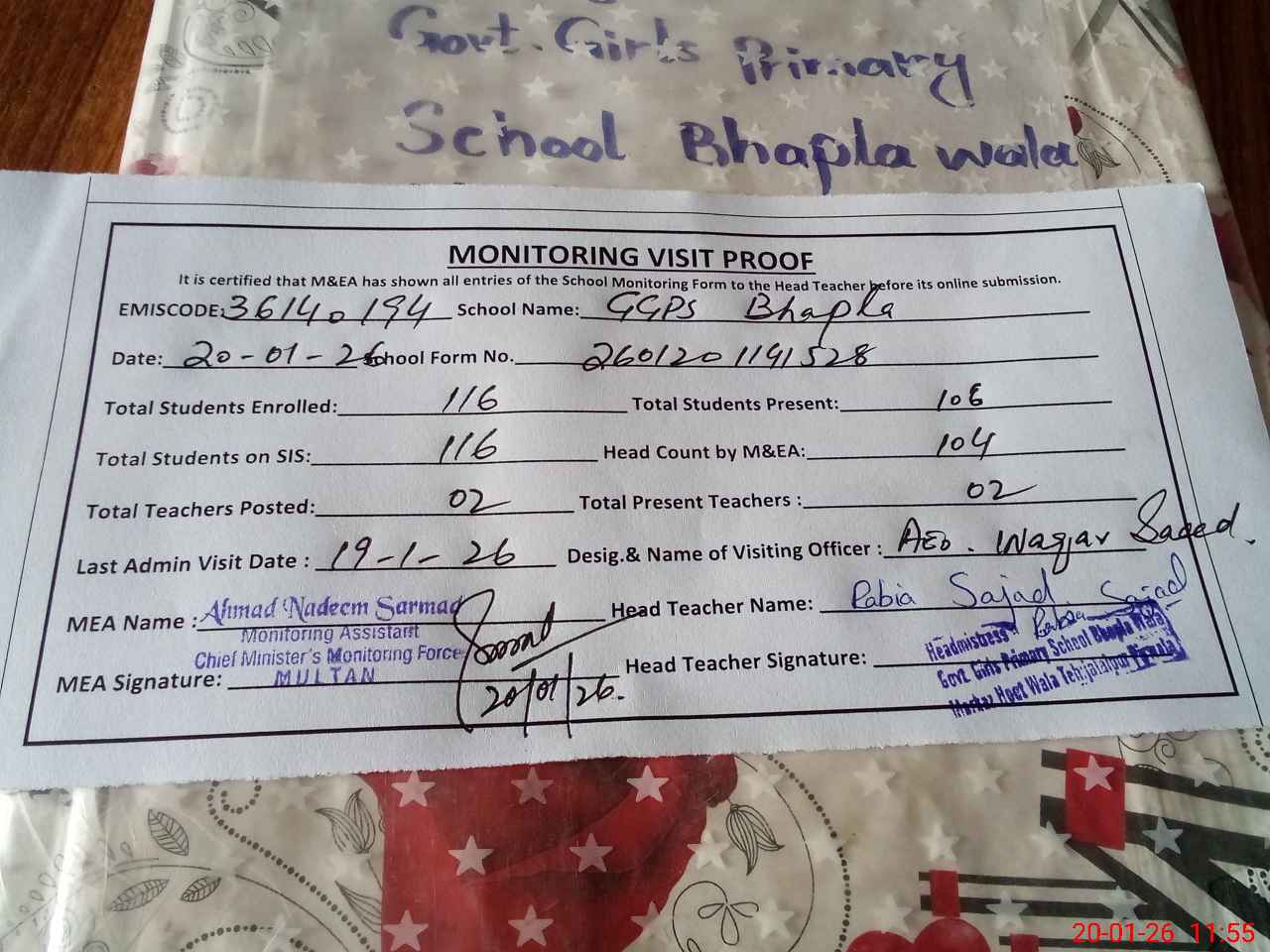 | EMIS Code: 36140194 | Name of School: GGPS BHAPLA WALA | |||