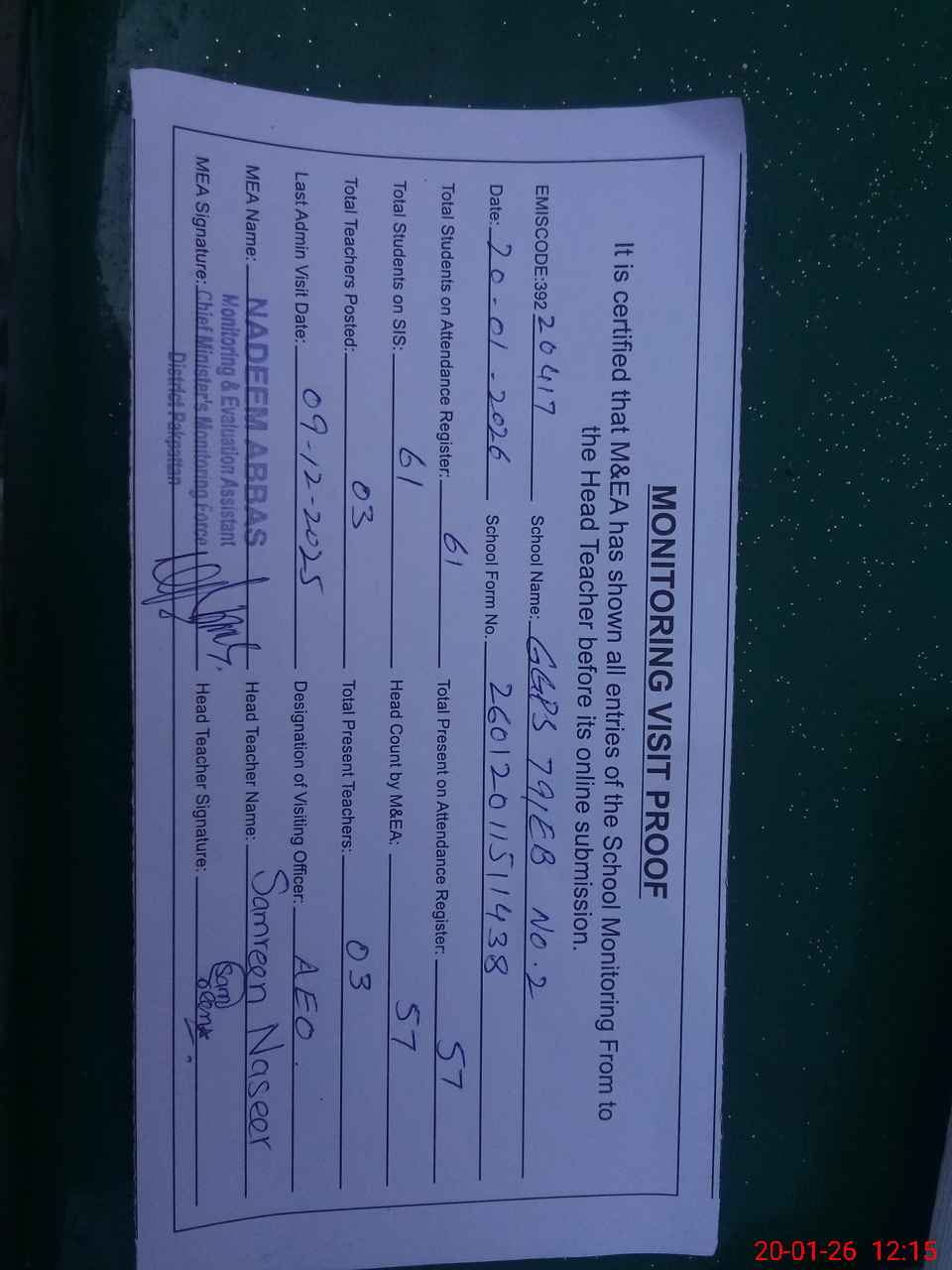 | Attendance Register | Head Teacher | MEA with School | Visit Proof |