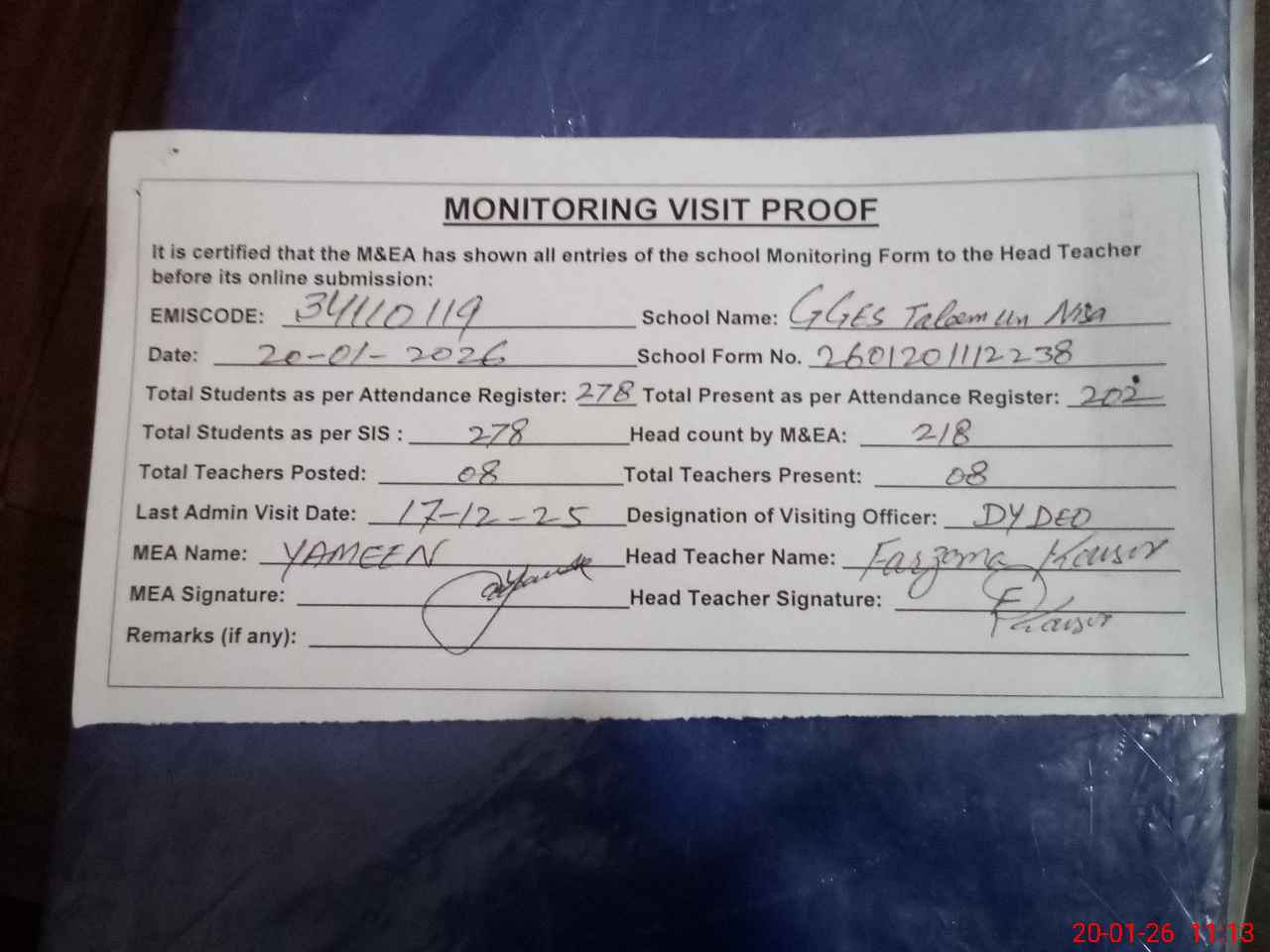 | Attendance Register | Head Teacher | MEA with School | Visit Proof |