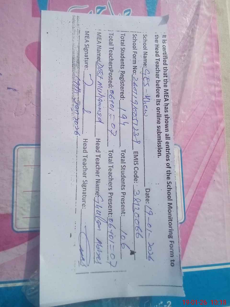 | Certified that this School was Inspected by the Undersigned MEA/DMO Today and the Information Stated Above is as Per Record. | |||||
