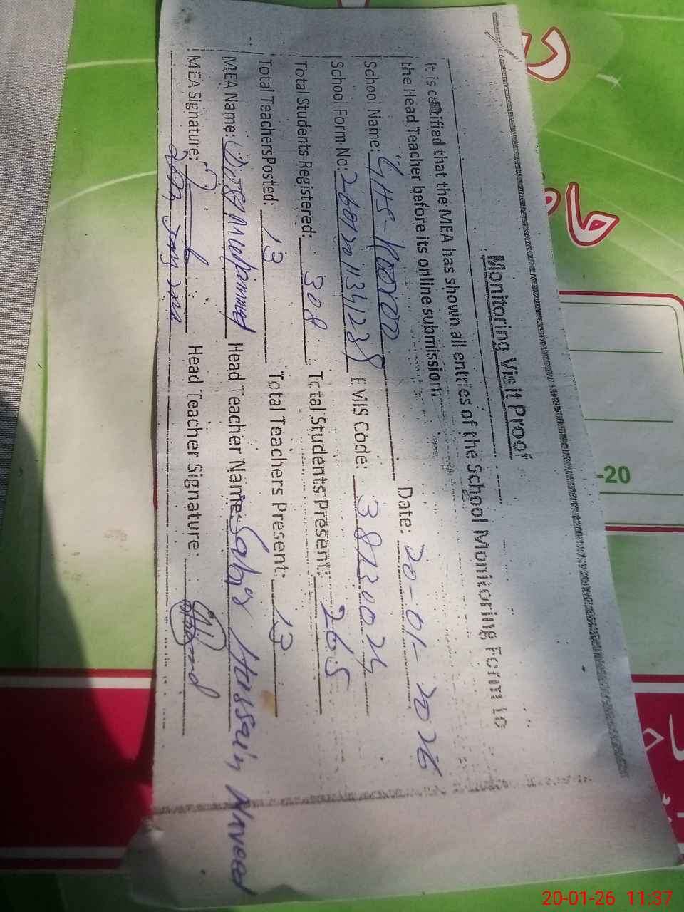 | Attendance Register | Head Teacher | MEA with School | Visit Proof |