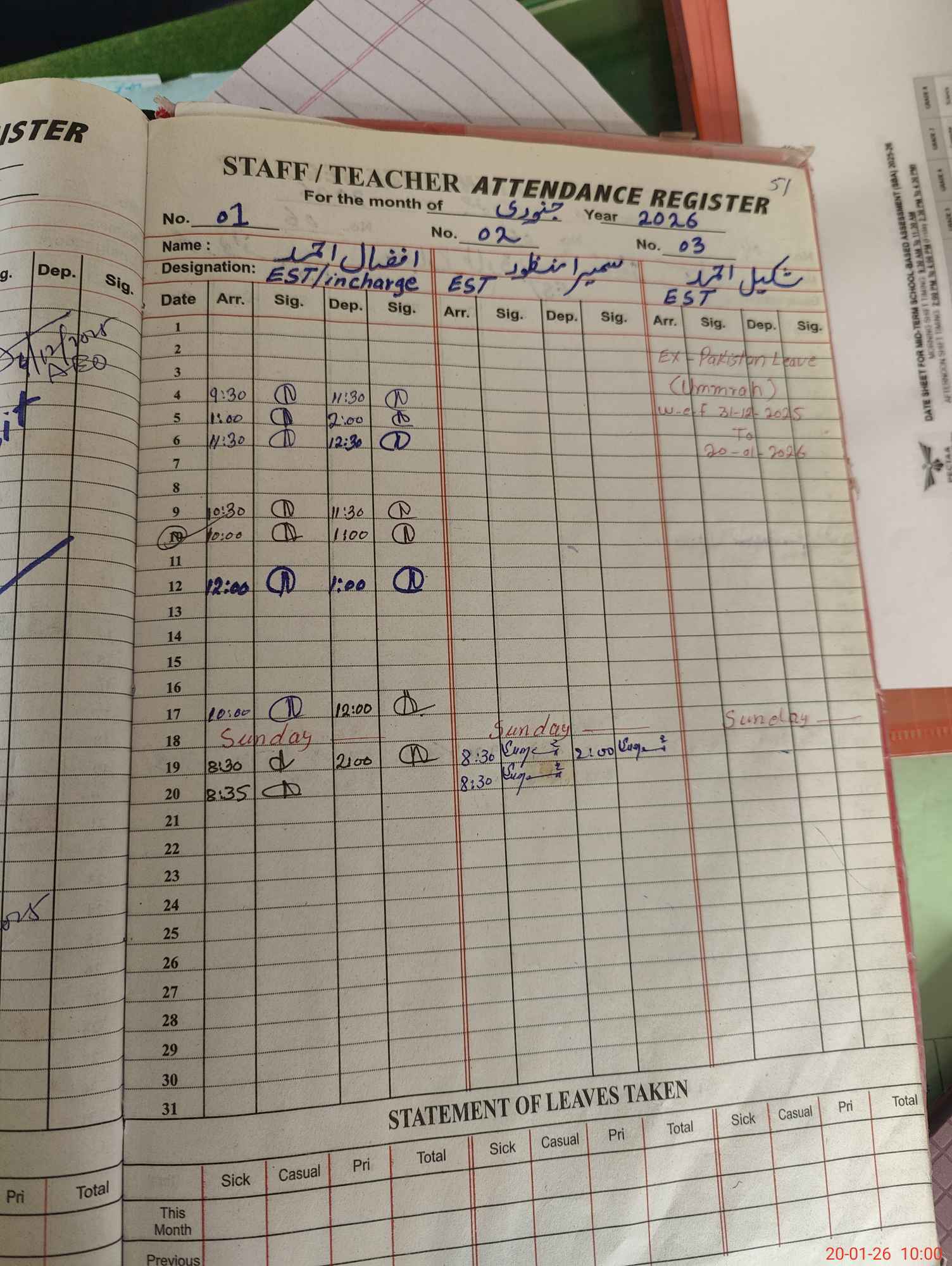 | CNIC | Full Name | Designation | R/C | Absence During Last Calender Month |