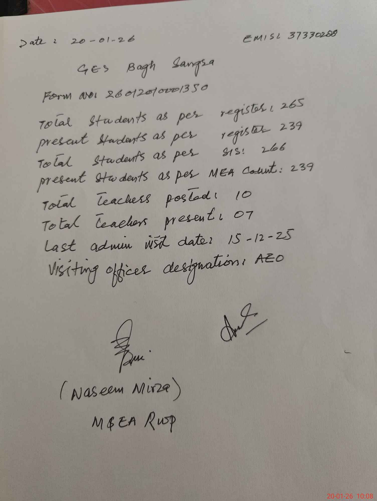 | Certified that this School was Inspected by the Undersigned MEA/DMO Today and the Information Stated Above is as Per Record. | |||||
