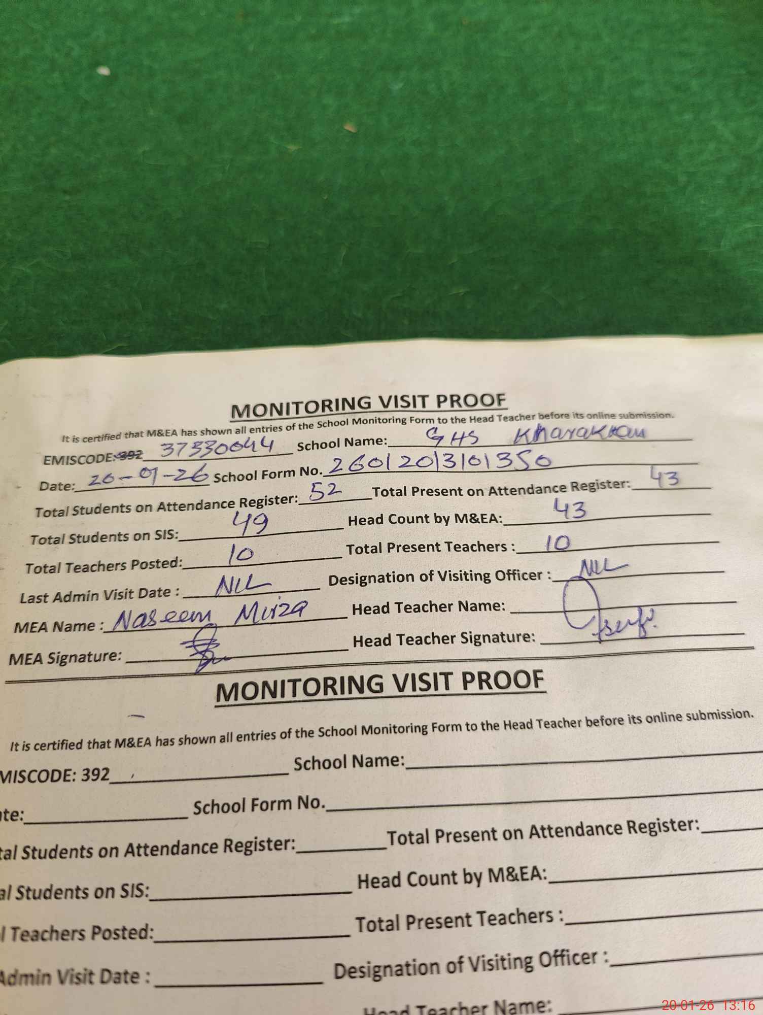 | Attendance Register | Head Teacher | MEA with School | Visit Proof |