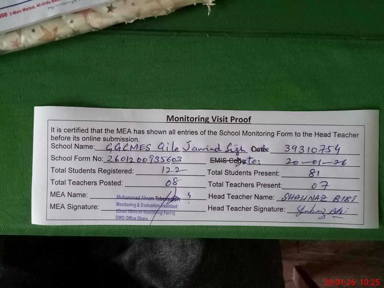 | Attendance Register | Head Teacher | MEA with School | Visit Proof |