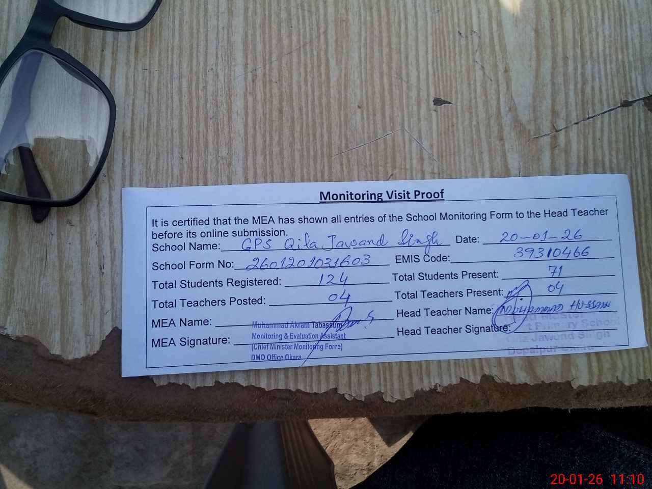 | Attendance Register | Head Teacher | MEA with School | Visit Proof |