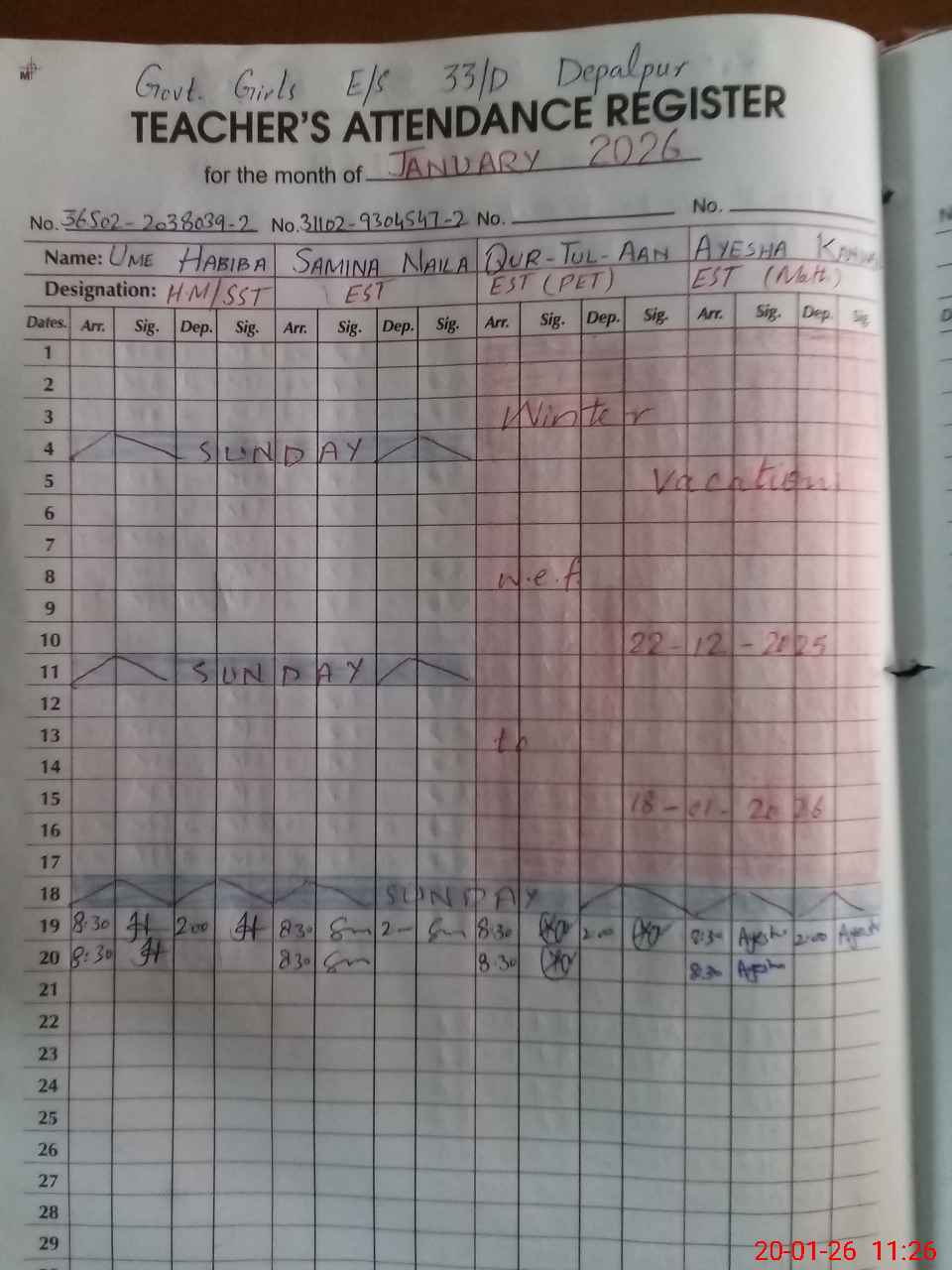 | Monitoring Date: 20-01-2026 | Start Time: 20-01-2026 11:25 AM | End Time: 20-01-2026 11:58 AM | Name of MEA: MU**** AK**** TA**** | |