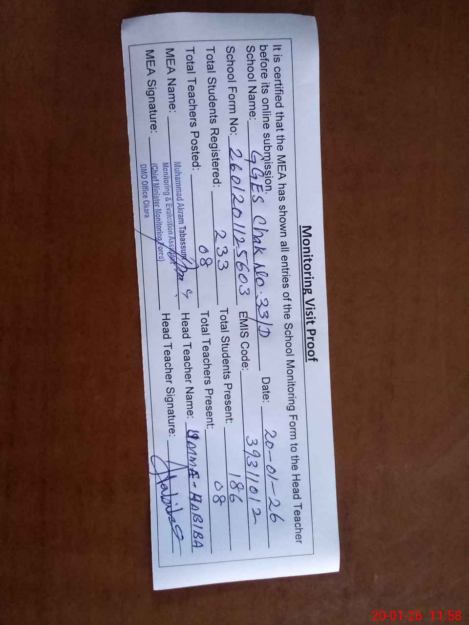 | Attendance Register | Head Teacher | MEA with School | Visit Proof |