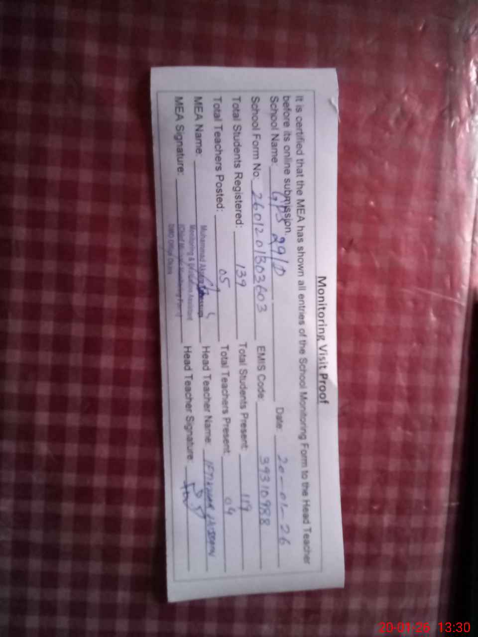 | Attendance Register | Head Teacher | MEA with School | Visit Proof |