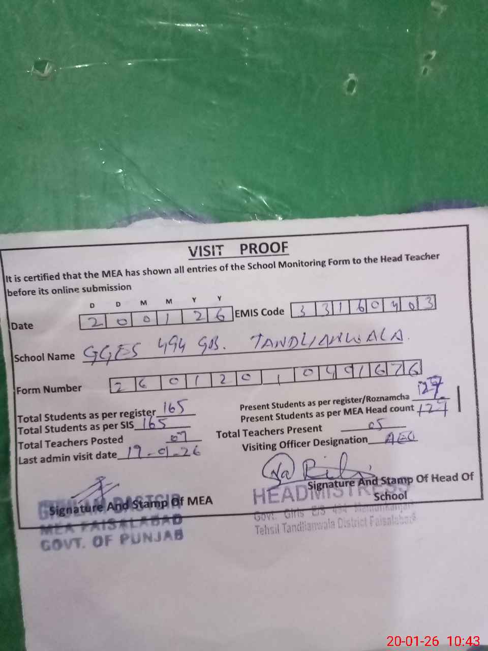 | Attendance Register | Head Teacher | MEA with School | Visit Proof |