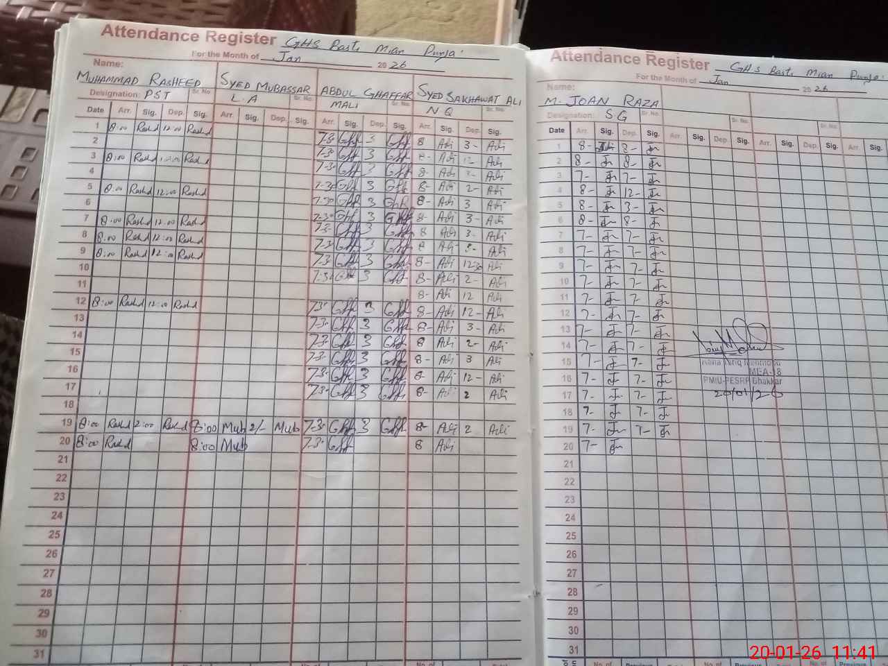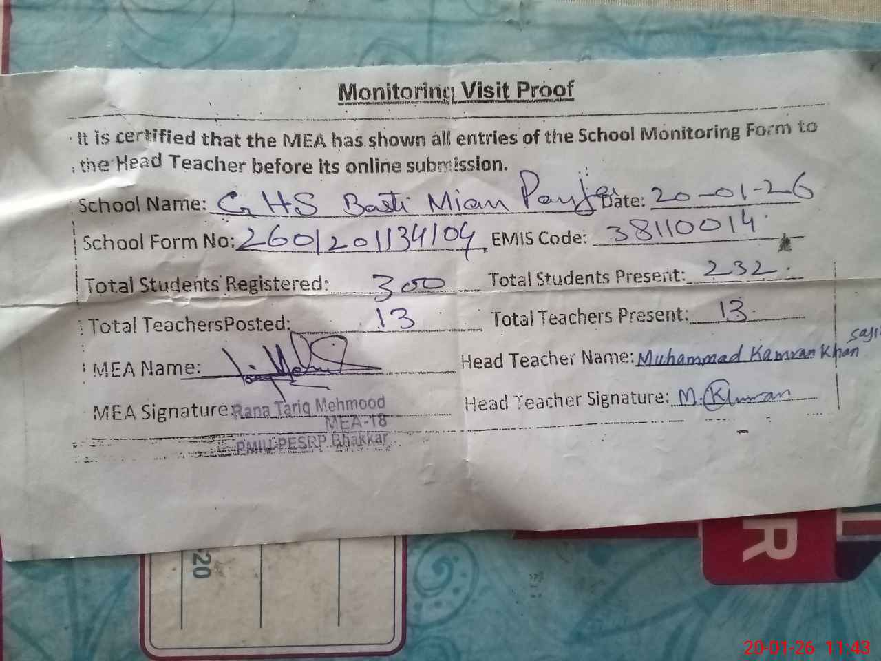 | Attendance Register | Head Teacher | MEA with School | Visit Proof |