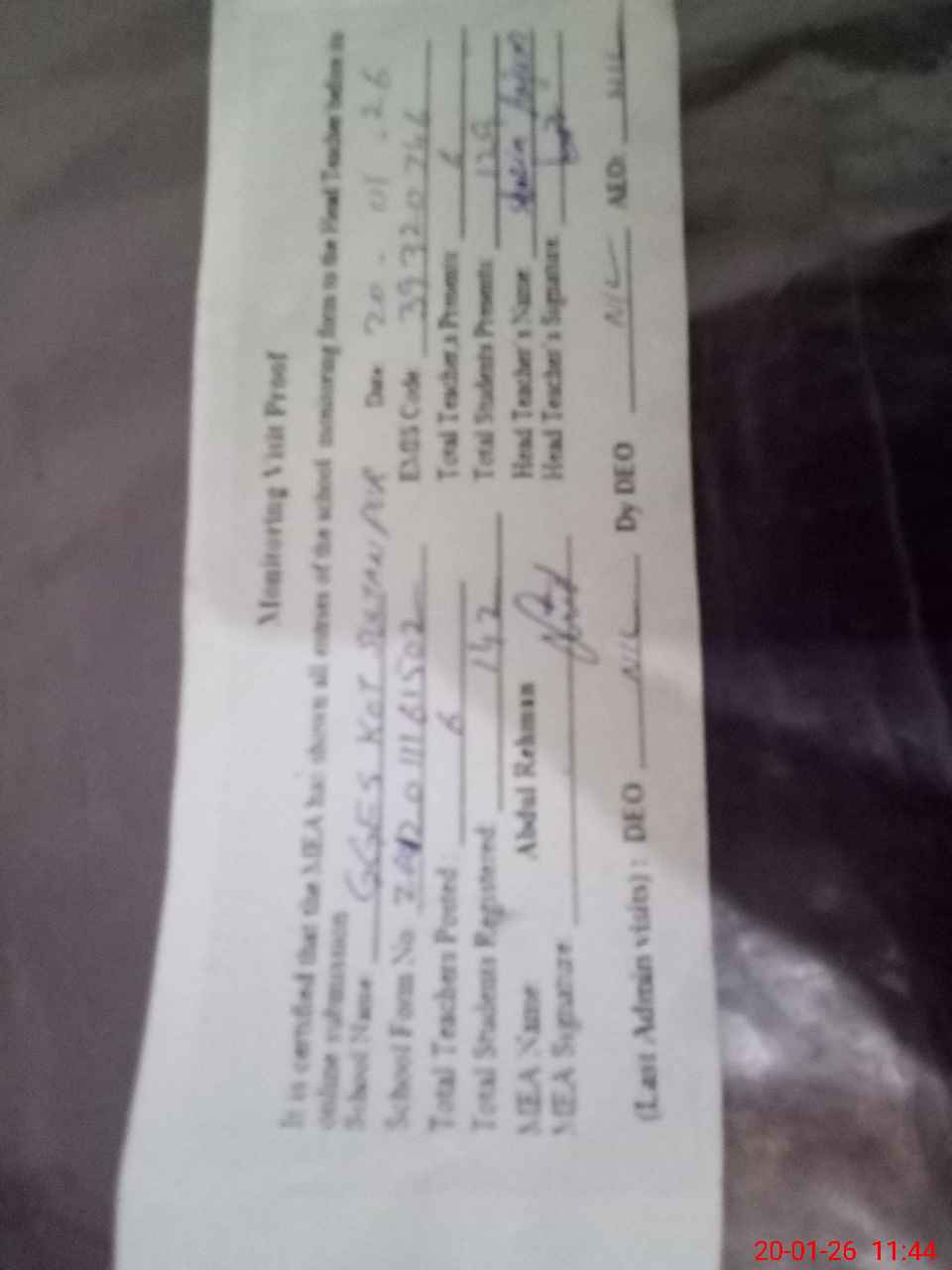 | Attendance Register | Head Teacher | MEA with School | Visit Proof |