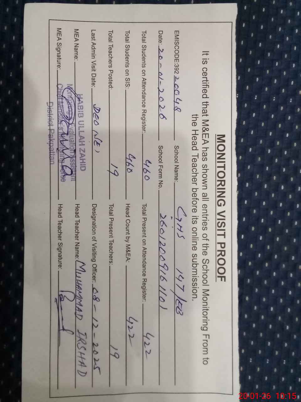 | Certified that this School was Inspected by the Undersigned MEA/DMO Today and the Information Stated Above is as Per Record. | |||||