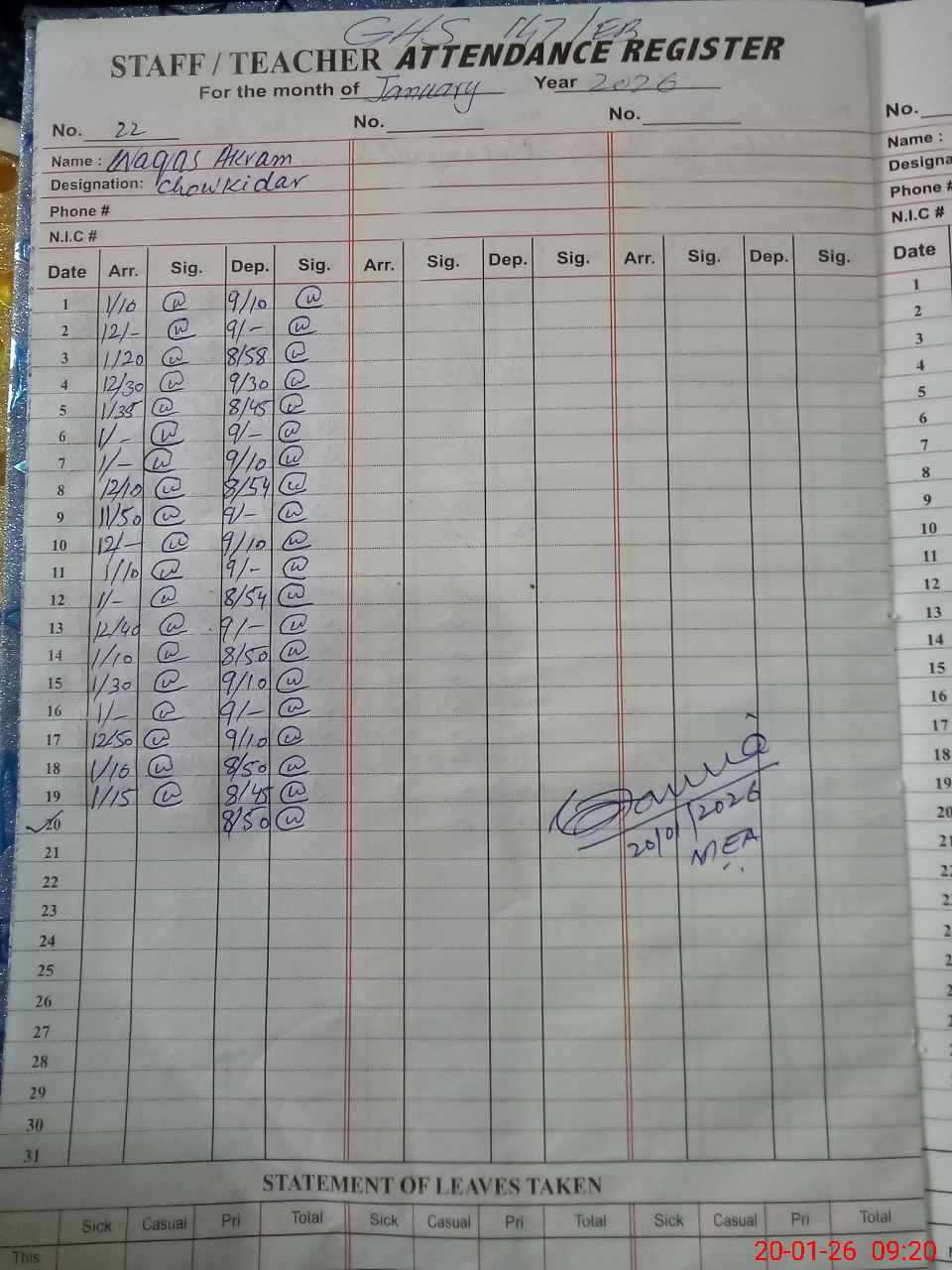 | Attendance Register | Head Teacher | MEA with School | Visit Proof |