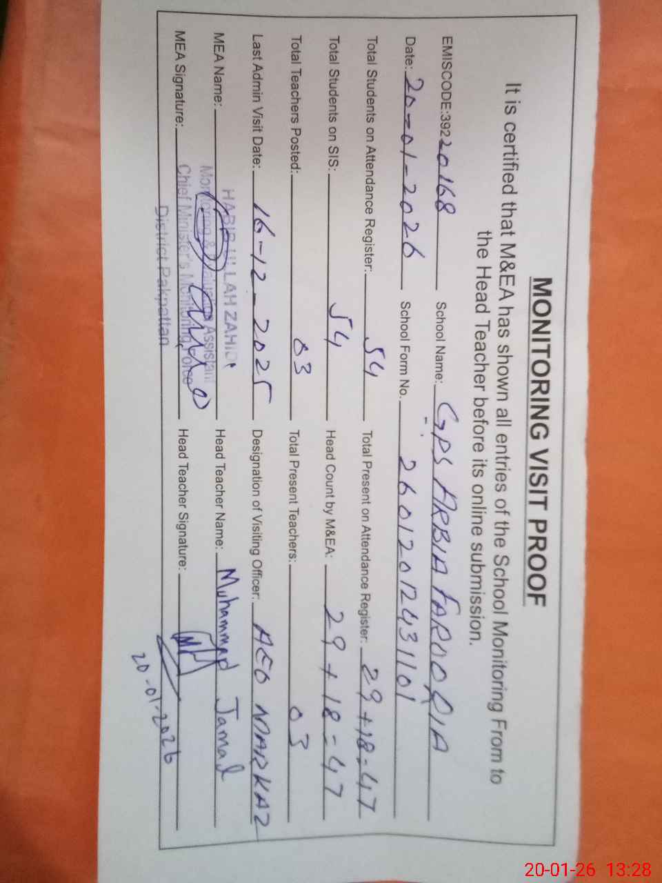 | EMIS Code: 39220168 | Name of School: GPS ARABIA FAROOQIA ARIFWALA J BLOCK | |||