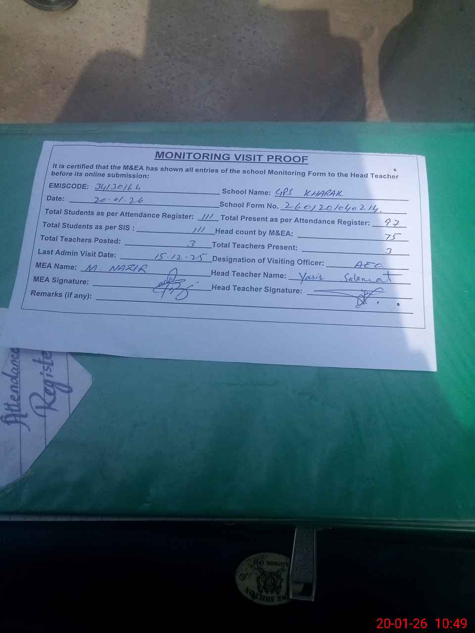 | Attendance Register | Head Teacher | MEA with School | Visit Proof |
