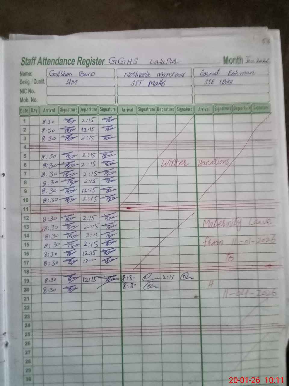 | CNIC | Full Name | Designation | R/C | Absence During Last Calender Month |