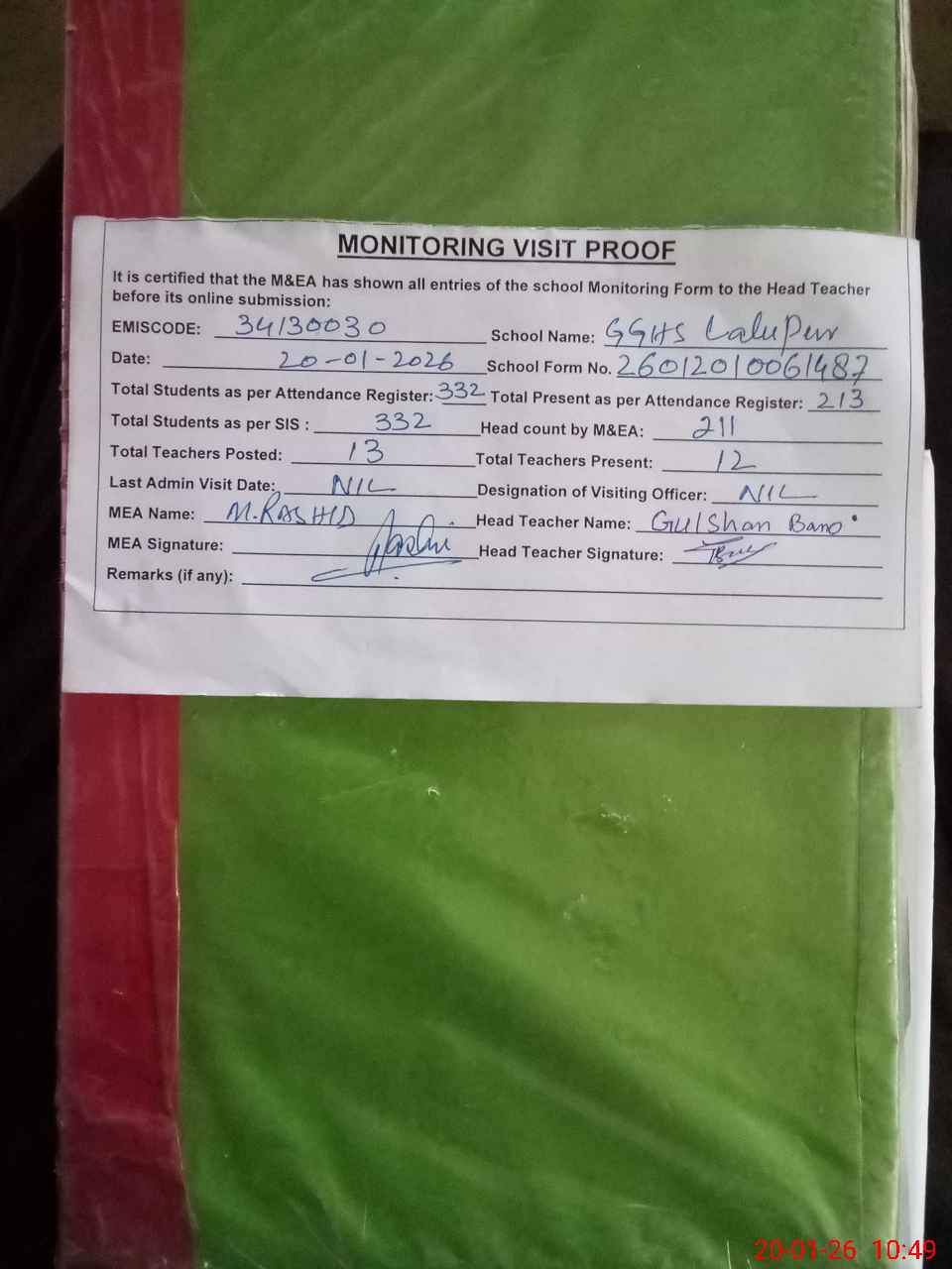 | Attendance Register | Head Teacher | MEA with School | Visit Proof |