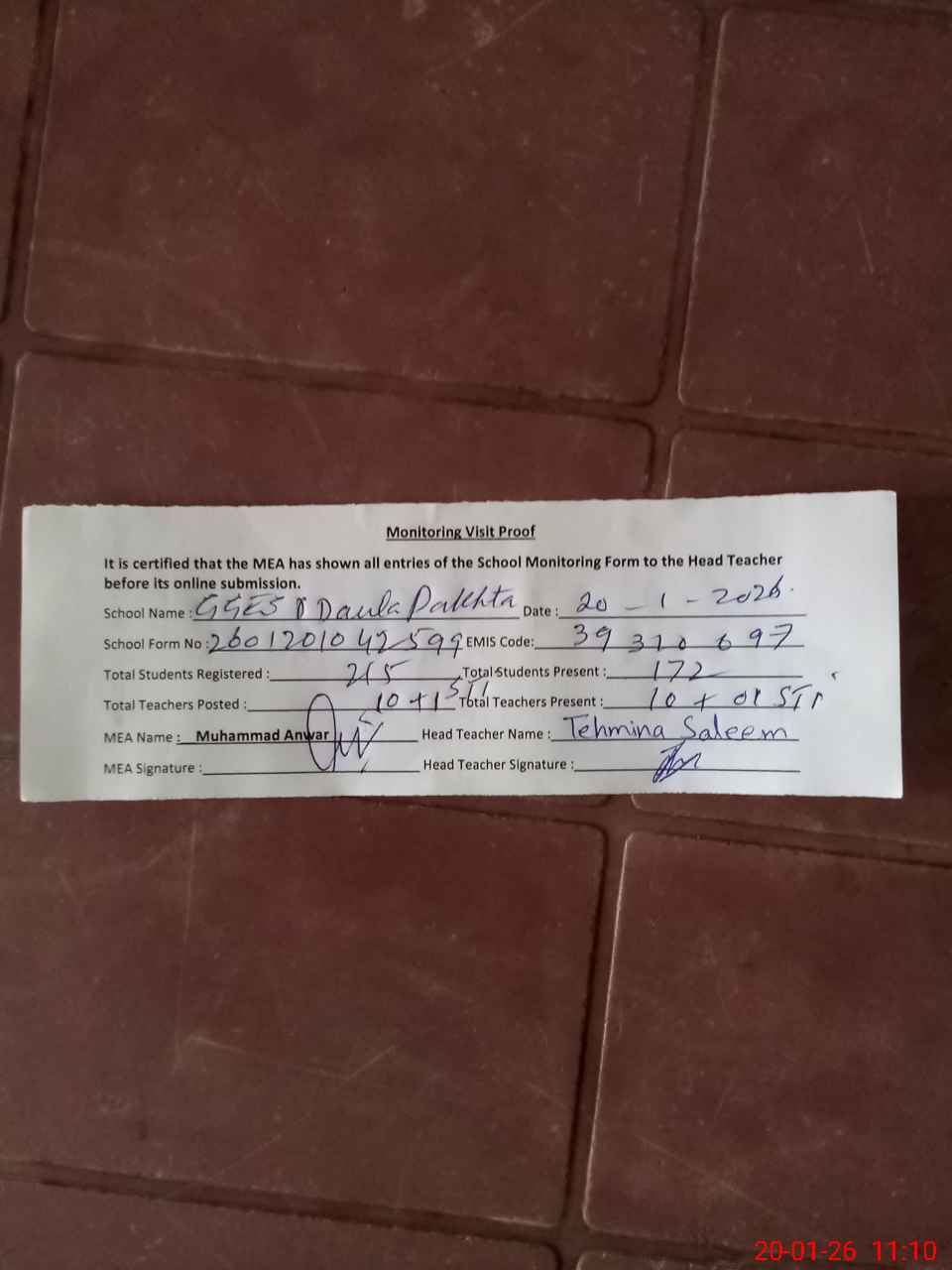 | Attendance Register | Head Teacher | MEA with School | Visit Proof |