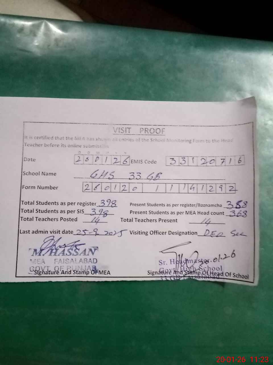 | Attendance Register | Head Teacher | MEA with School | Visit Proof |