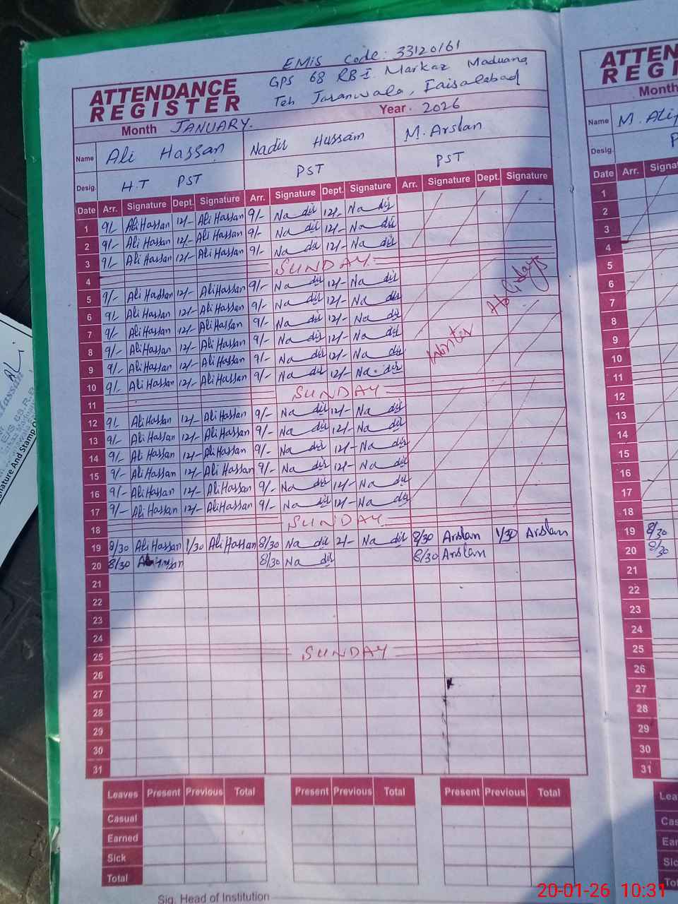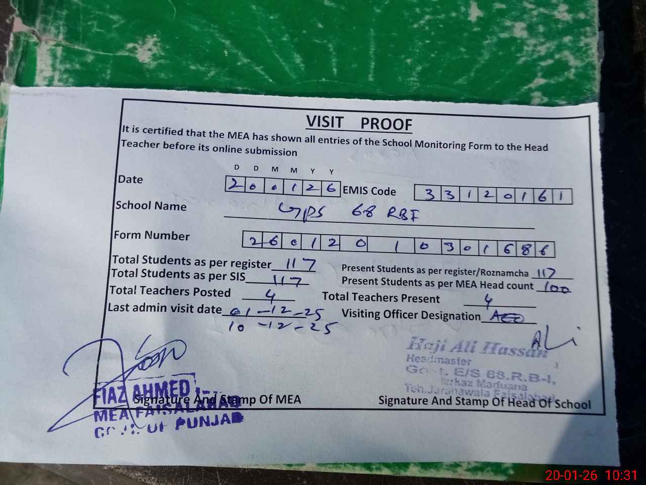 | Attendance Register | Head Teacher | MEA with School | Visit Proof |