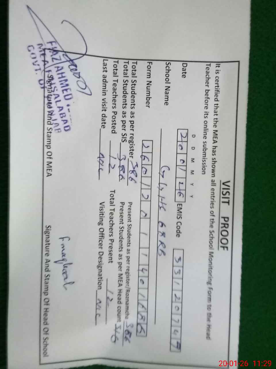 | Attendance Register | Head Teacher | MEA with School | Visit Proof |