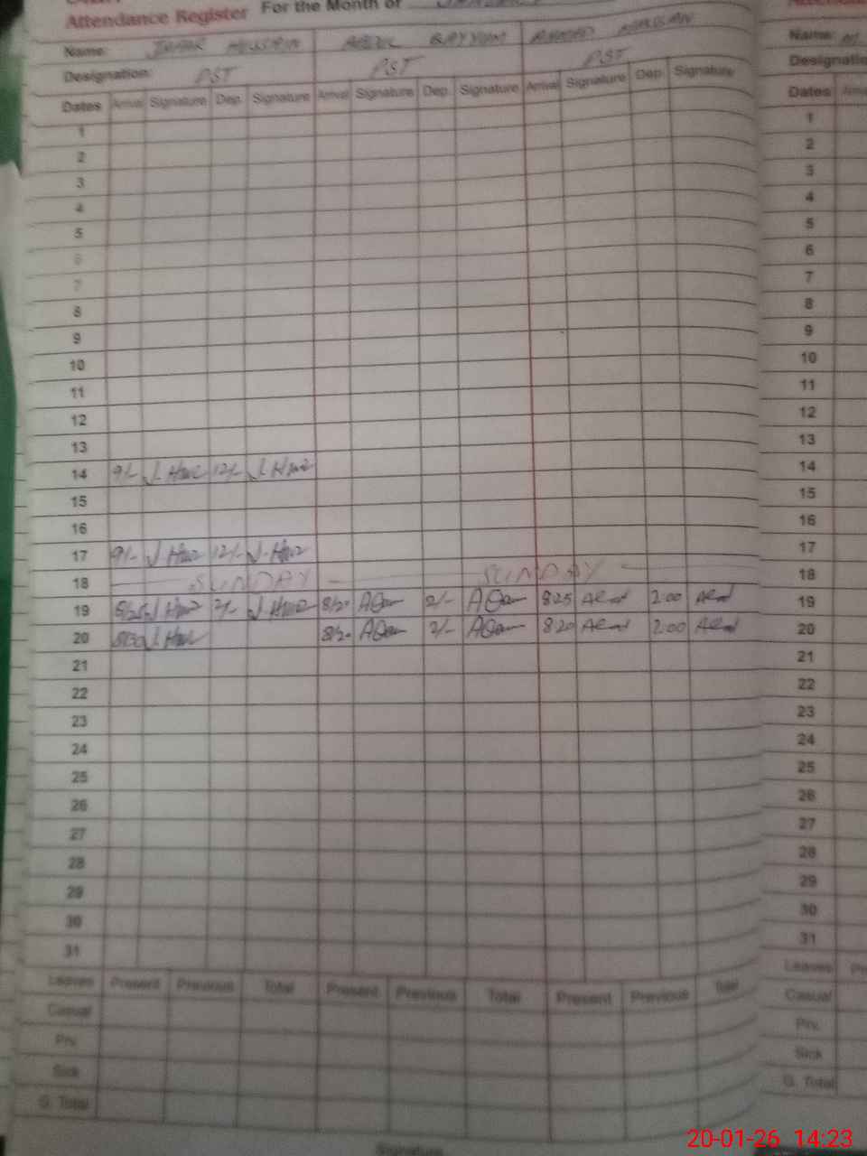 | CNIC | Full Name | Designation | R/C | Absence During Last Calender Month |