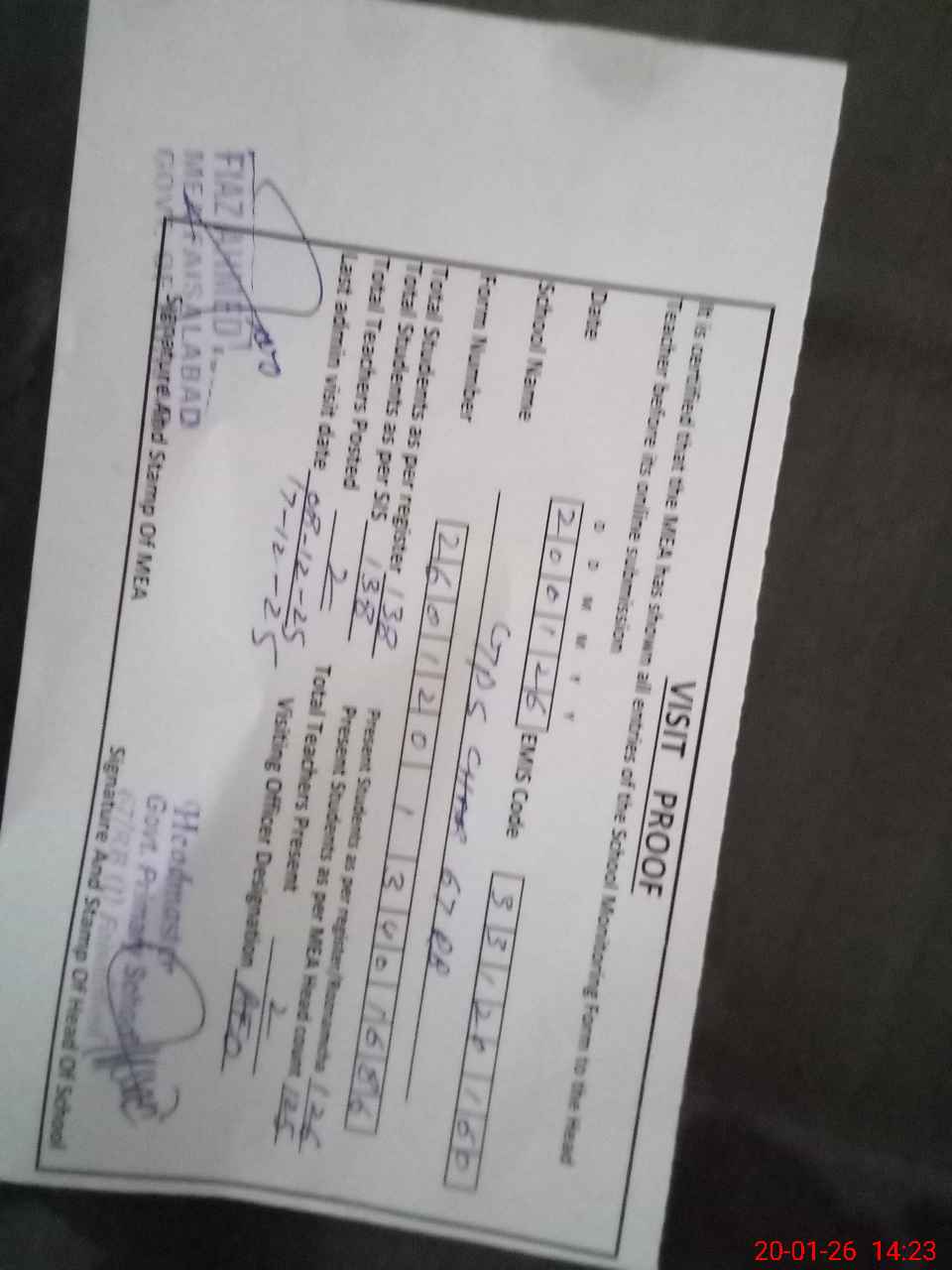 | Attendance Register | Head Teacher | MEA with School | Visit Proof |