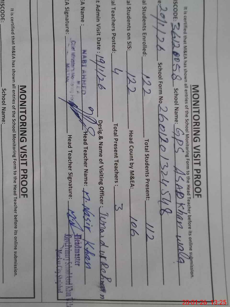 | Name: MNA**** Designation: (School Headmaster's/Headmistress's) HEADMASTER Phone/Cell Number: 03**** |