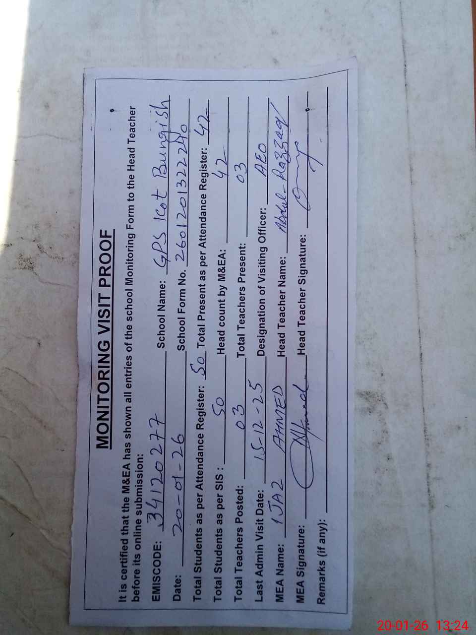 | Attendance Register | Head Teacher | MEA with School | Visit Proof |