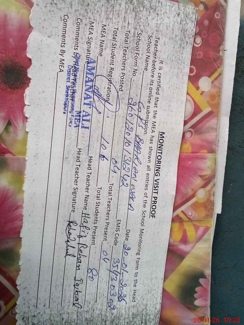 | Attendance Register | Head Teacher | MEA with School | Visit Proof |