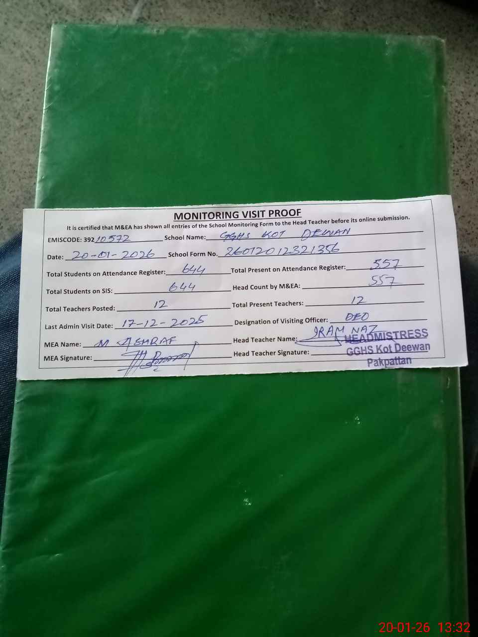| Attendance Register | Head Teacher | MEA with School | Visit Proof |