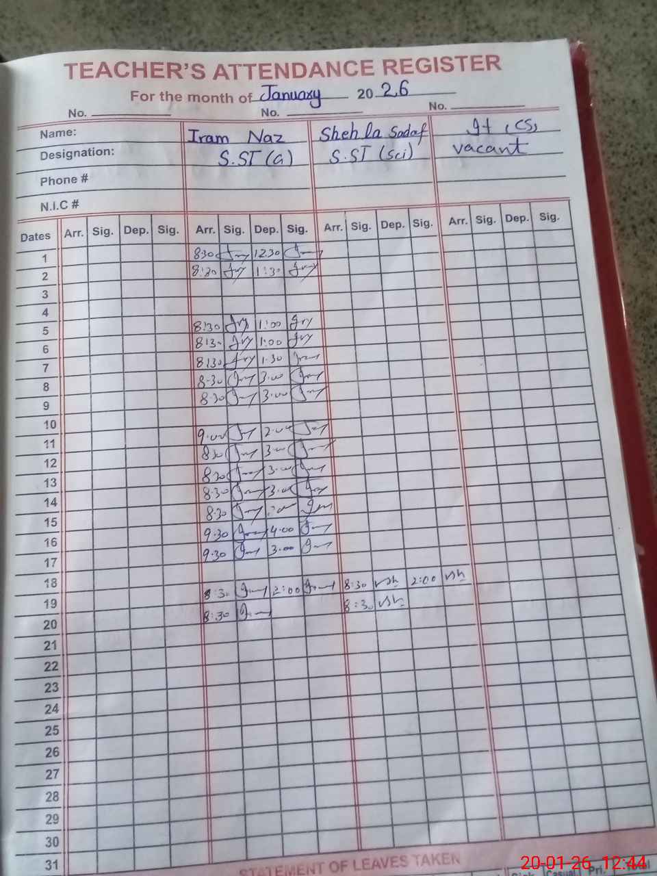 | CNIC | Full Name | Designation | R/C | Absence During Last Calender Month |