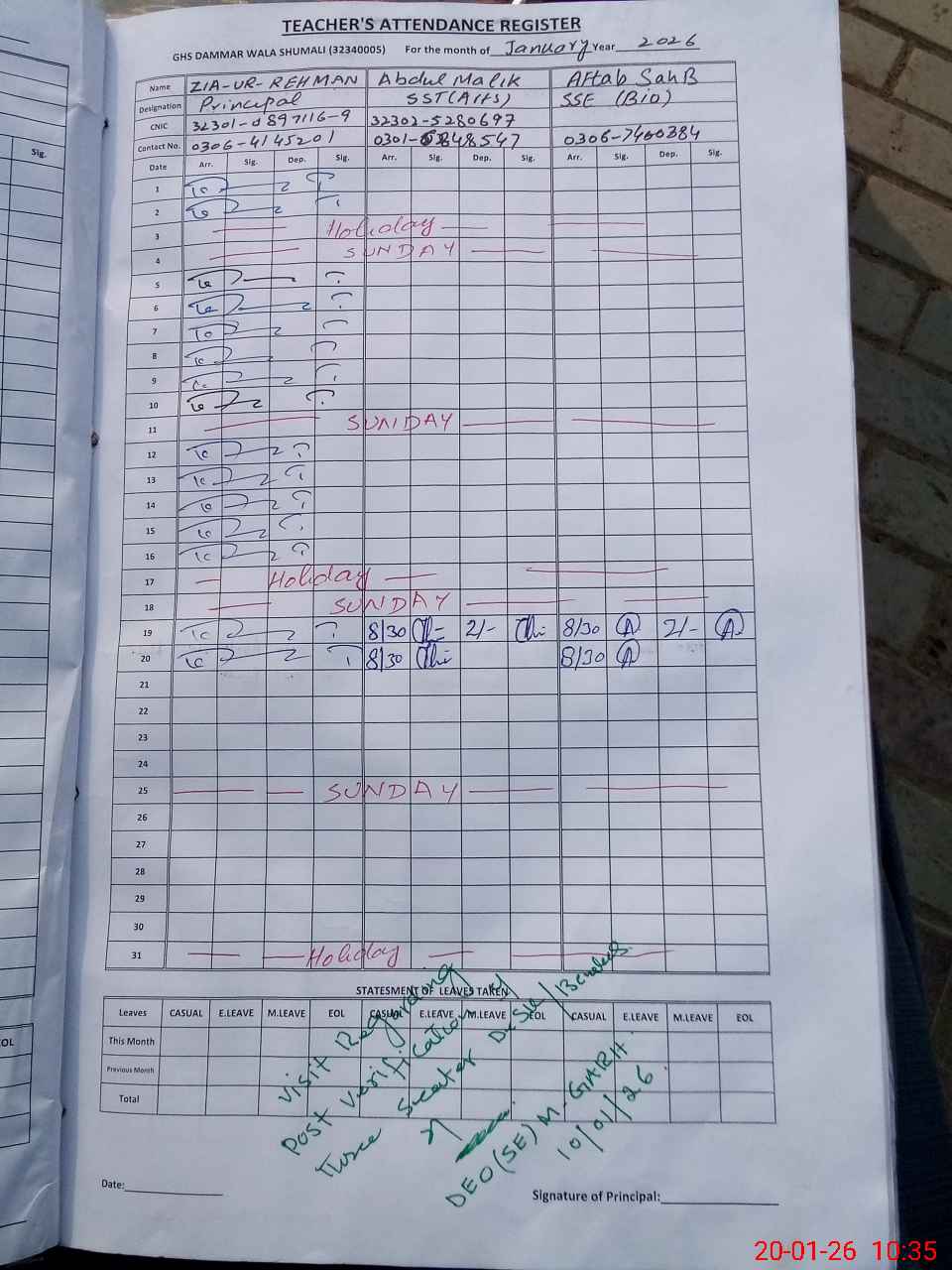 | Name: Zi**** UrRe**** Designation: (School Headmaster's/Headmistress's) Principal Phone/Cell Number: 03**** |