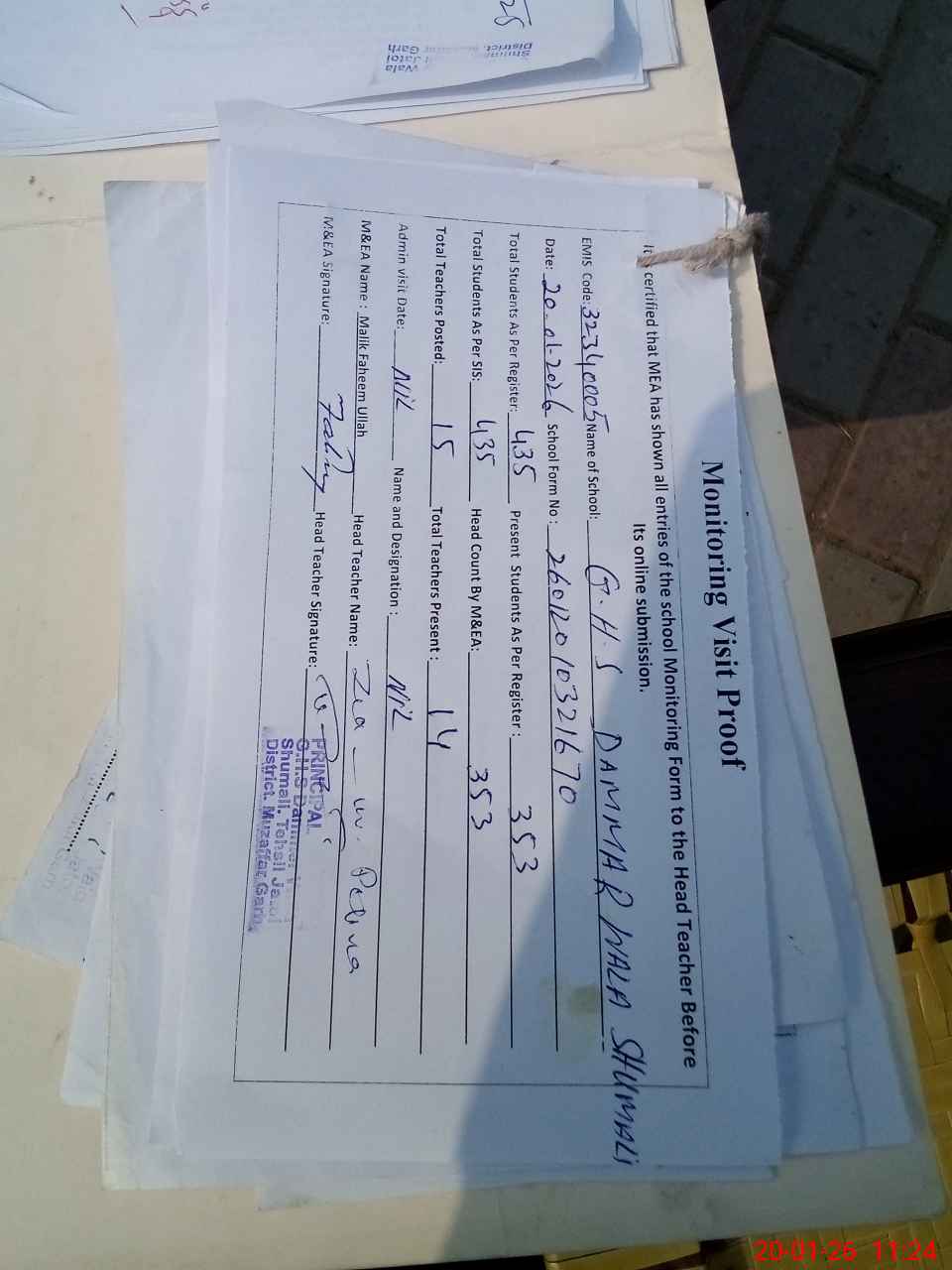 | Attendance Register | Head Teacher | MEA with School | Visit Proof |