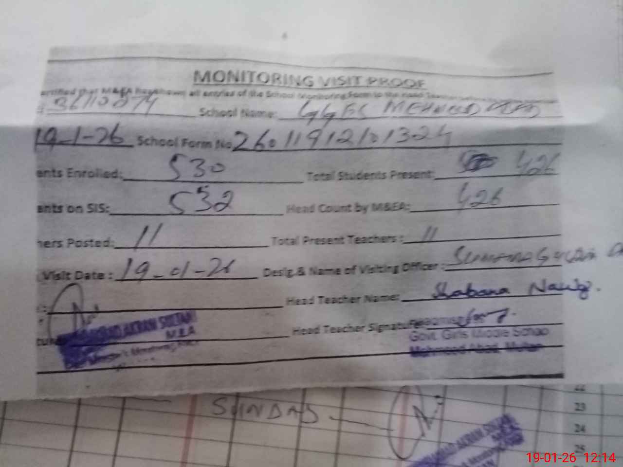 | Attendance Register | Head Teacher | MEA with School | Visit Proof |
