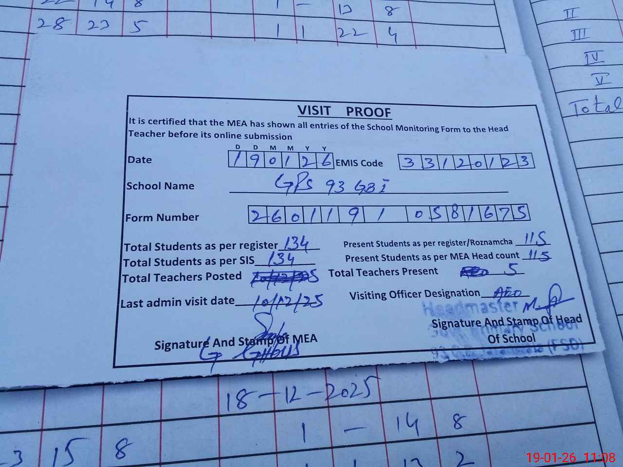 | Attendance Register | Head Teacher | MEA with School | Visit Proof |