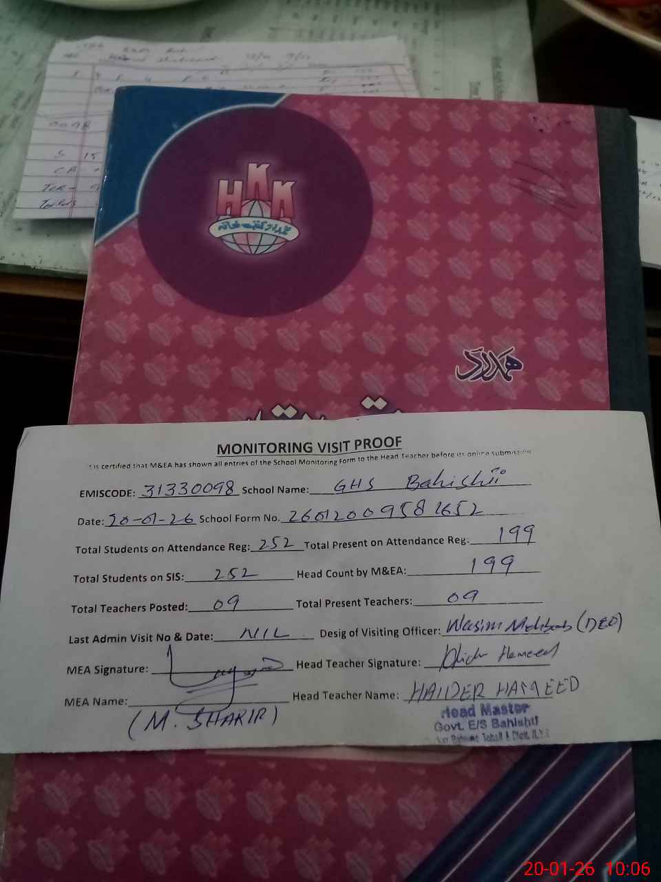 | Attendance Register | Head Teacher | MEA with School | Visit Proof |