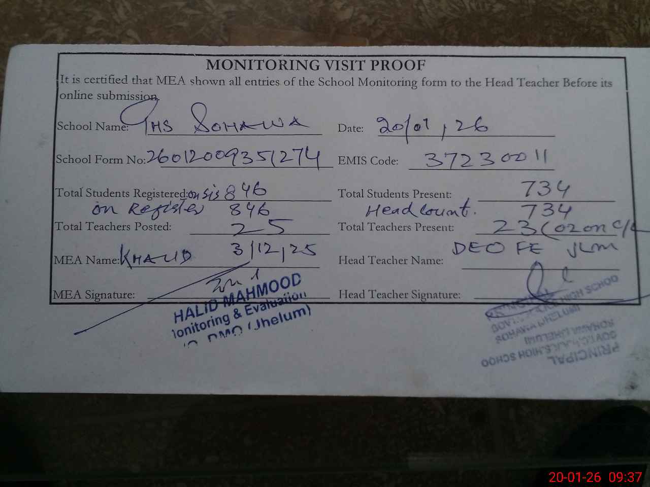 | Attendance Register | Head Teacher | MEA with School | Visit Proof |