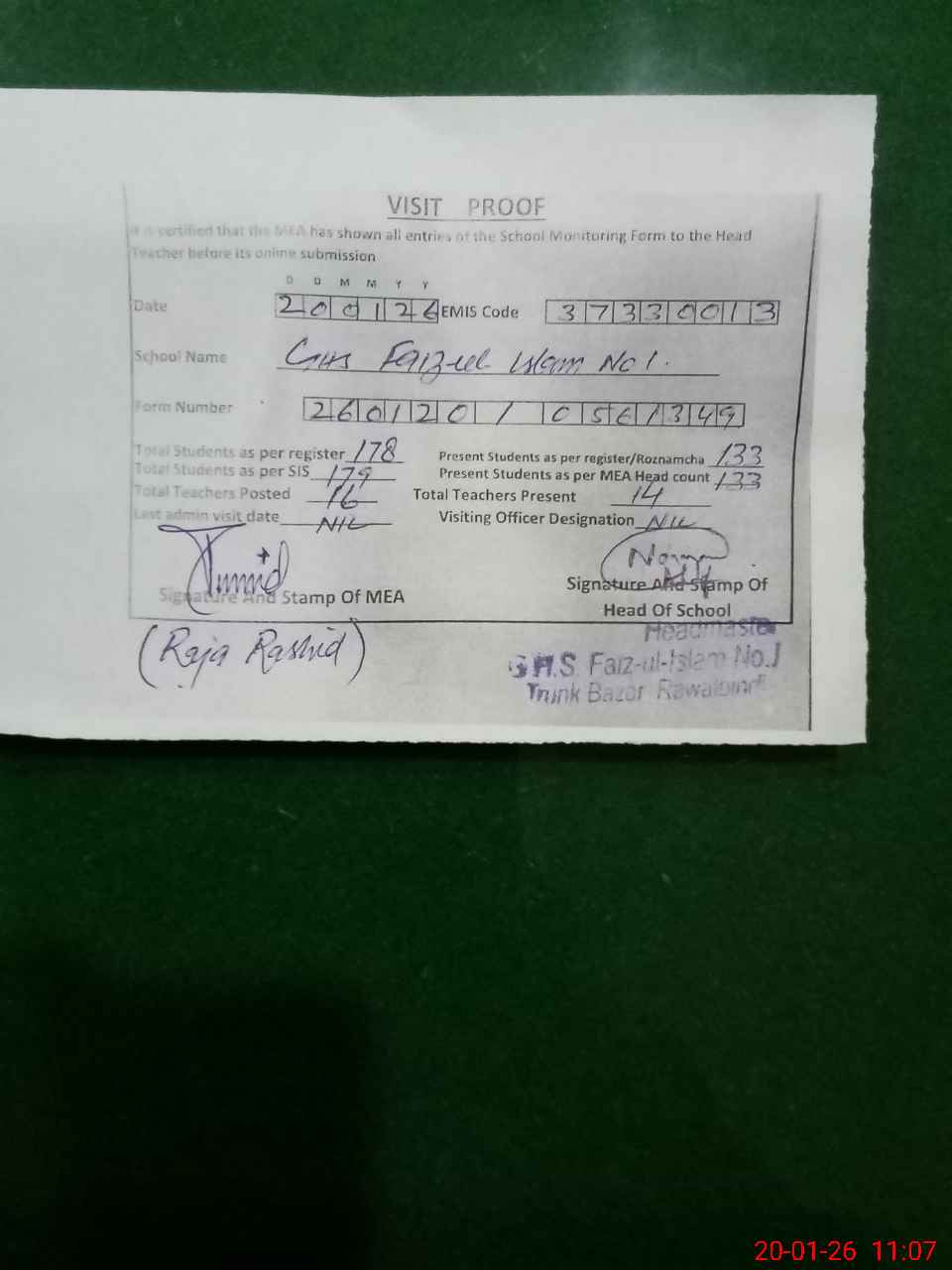 | Attendance Register | Head Teacher | MEA with School | Visit Proof |