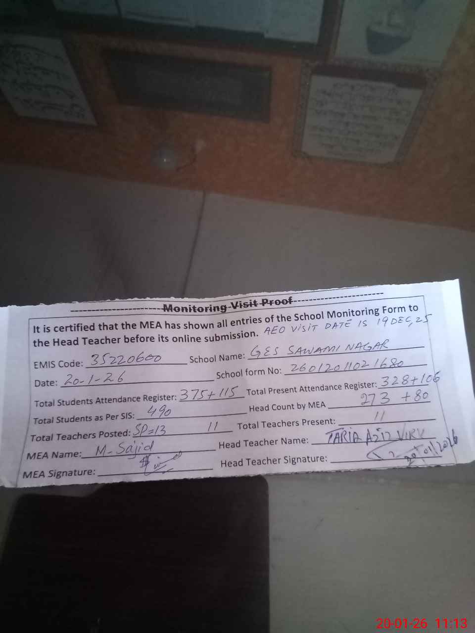 | Remarks (Use Separate Page if Required): 81 students difference found in Roznamcha and head count Class four attendance is noted from roznamcha as it is in second shift and register was under lock and key Only one soap found at hand wash points 35220600 | |||||